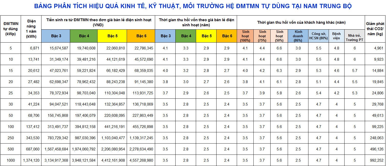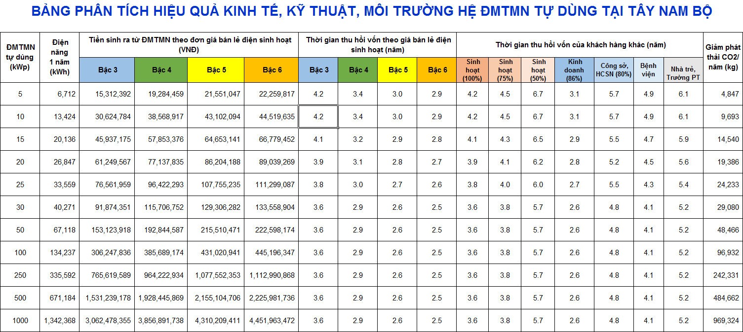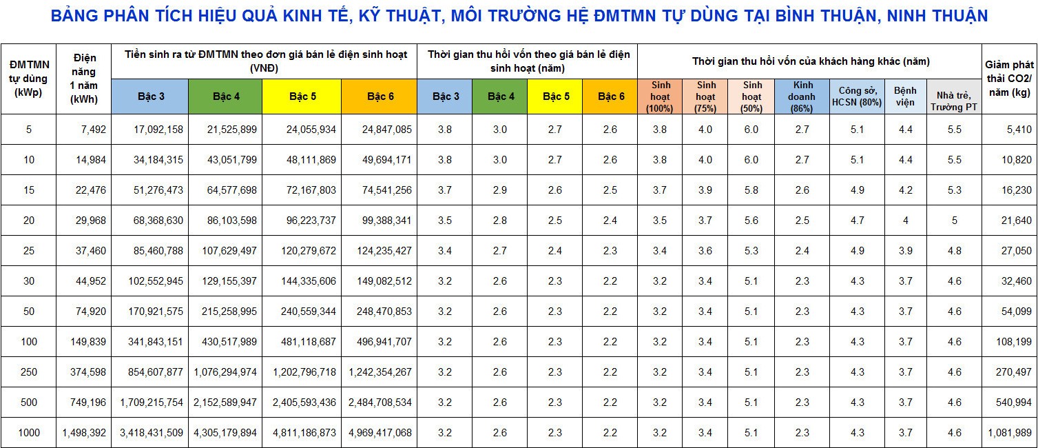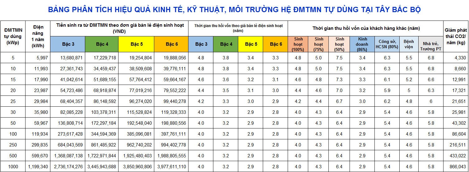 Phân tích bài toán hiệu quả về kinh tế, kỹ thuật và môi trường khi triển khai hệ thống điện mặt trời mái nhà tự dùng tại 10 khu vực có điều kiện thời tiết và nguồn bức xạ khác nhau, bao gồm các khu vực: Đông Bắc bộ, Tây Bắc bộ, Đồng bằng sông Hồng, Bắc Trung bộ, Nam Trung bộ, Tây Nguyên, Bình Thuận, Ninh Thuận, Đông Nam bộ, Tây Nam bộ và TP. HCM. Đây có thể là cơ sở tham khảo để xác định nhu cầu lắp đặt điện mặt trời mái nhà tự dùng trong thời gian sắp tới.